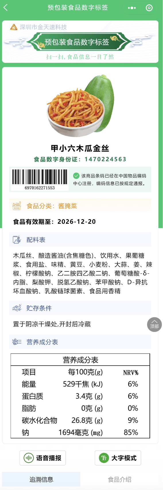 数字标签是指借帮数字化手段展现预包拆食物标签消息的新型体例。消费者通过手机扫描包拆上的二维码,即可跳转至数字标签页面,获取配料表、养分成分、出产工艺。