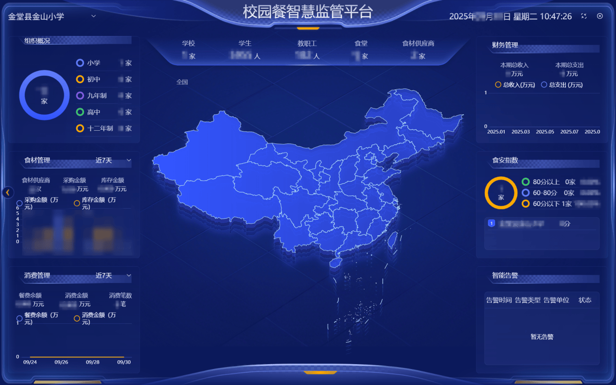 数智监管系统——校园餐饮的“聪慧大脑”。全面办理学校、食堂、师生等根本消息,实现从采购、消费到财政、炊事的全流程数字化监管。系统支撑订单查询、食材竞价、出入汇总、并通过预警核心及时监测食材临期、天分过时等风险,数据报表从动生成,帮力校园餐饮办理更通明、更高效、更平安。