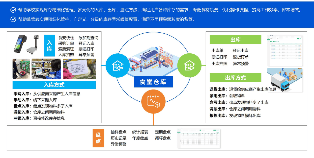 食材办理系统——通明高效的“采购取仓储帮手”。食材采购办理系统,努力于打制公开、公允、高效的食材采购,学校可通过系统间接下单、倡议竞价采购,并及时订单形态。系统还支撑供应商办理、和谈价磋商等功能,确保采购过程规范可控、价钱合理,从泉源上保障食材质量取成本可控。食堂收支库办理系统,可实现对食材库存的精细化办理,涵盖入库、出库、清点、调拨、报损等全流程操做。通过库存查询取领用记实,系统帮帮食堂及时控制物资动态,避免华侈取欠缺,提拔仓储办理效率,确保每一份食材都可逃溯、可办理。