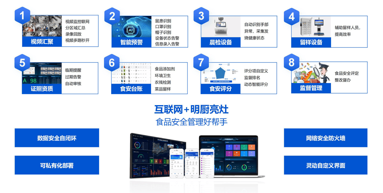 互联网+明厨亮灶系统——看得见的“食物平安卫士”。通过视频、AI智能阐发、物联网设备等手段,实现对后厨操做的及时监视取风险预警。支撑学校自查、整改、赞扬等功能,让“明厨亮灶”实正落地,保障食物平安全程可控、家长监视渠道通顺,建立校园餐饮的“通明厨房”。